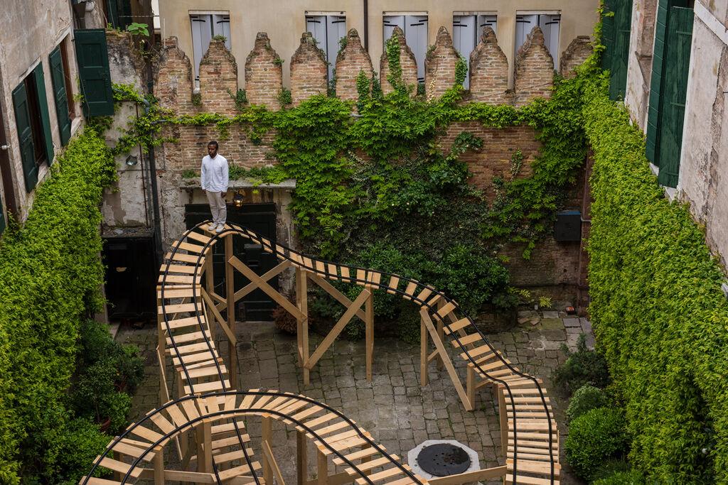 At the heart of “Brake Run Helix” is a rideable sculptural roller coaster. Filling Building 5’s 100-yard-long gallery, the exhibit also includes paintings, a stage for performances, and freestanding sculptures inspired by the form and function of roller coasters. Hill’s practice focuses on experiences that intermingle public struggle, endurance, trauma, and joy, whether within athletics, religion, the American education system or amusement parks. In the United States, amusement parks were contested sites throughout Jim Crow-era desegregation efforts for equitable access to pleasure, leisure and recreation.
